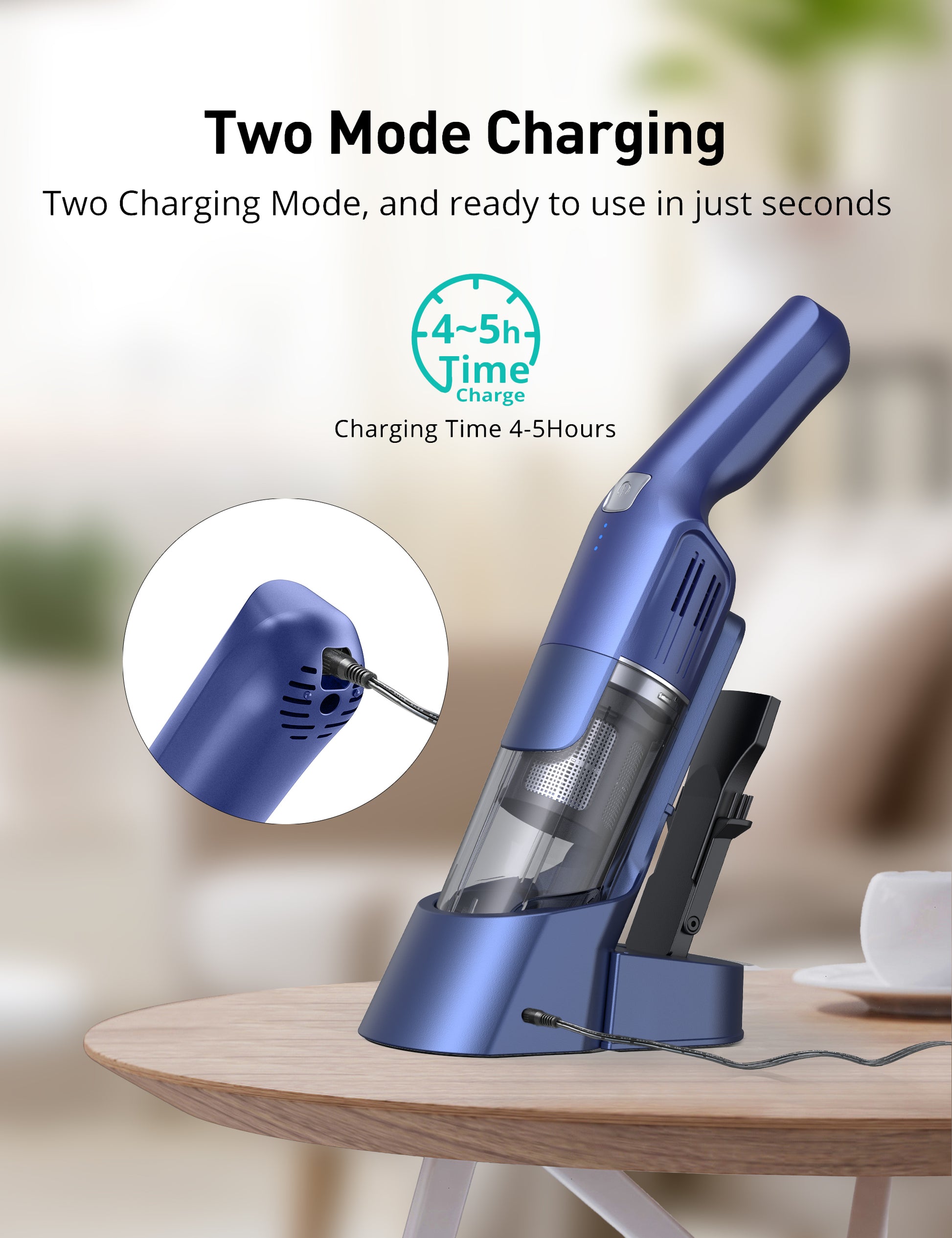 - Versatile Charging Options: The handheld vacuum is equipped with dual charging ports for faster and more convenient charging, this cordless vacuum can be charged on a docking station or the charging cable can be directly plugged into the device.