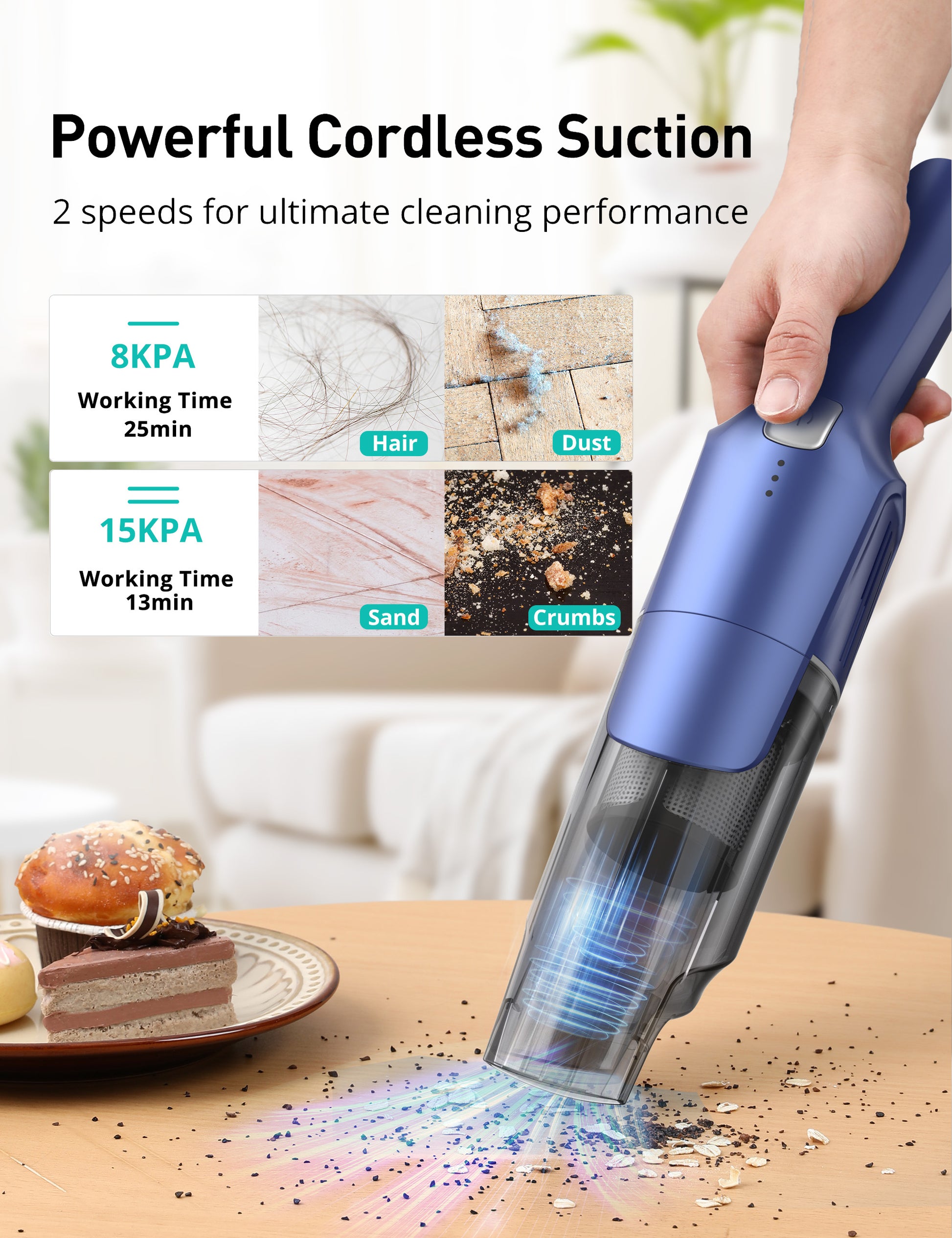- Lasting Power & Fast Charging: This handheld vacuum cleaner is equipped with a large capacity battery and fast charging tech. It could work constantly for 25 minutes at the lower suction level and 13 minutes at the higher suction level after 4-5 hours full charging.